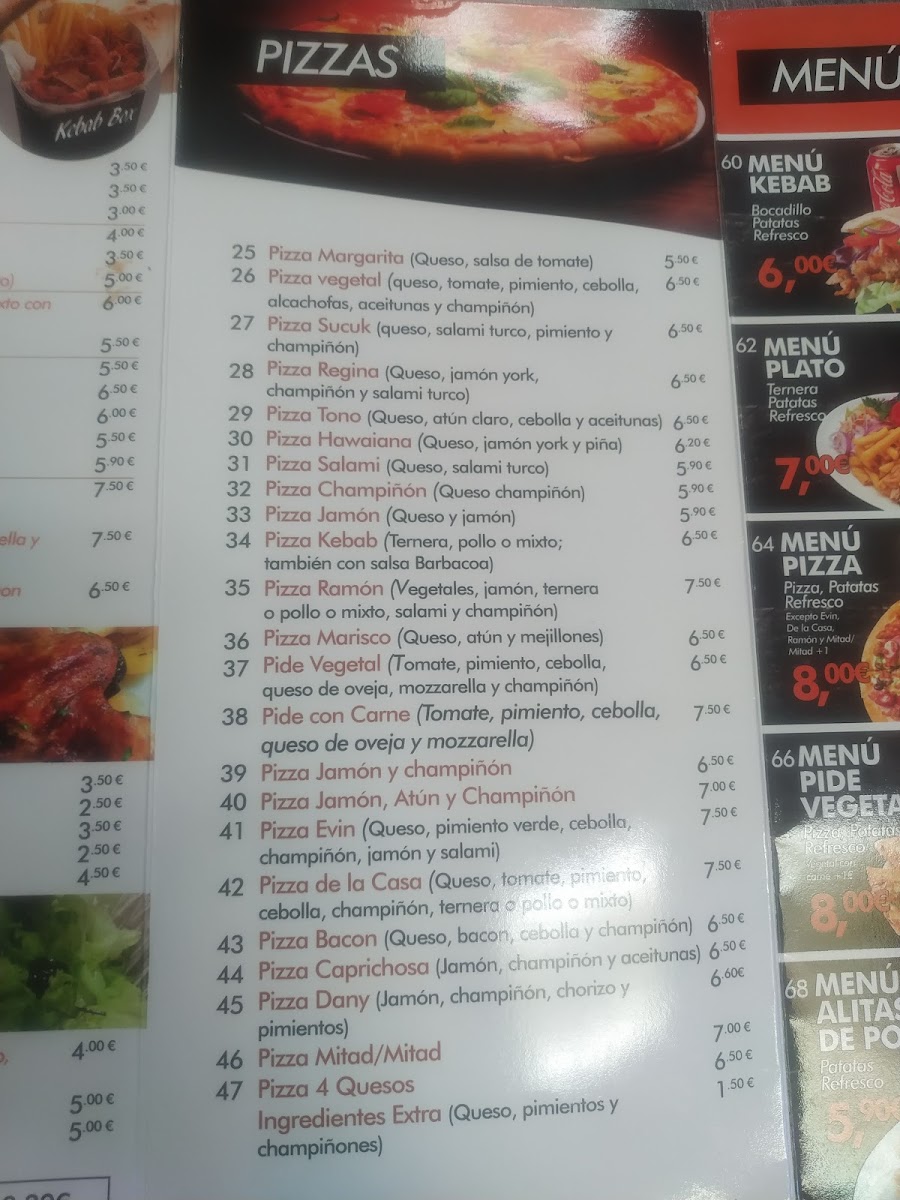 Welcome to Evin Kebap y Pizza, your delightful Turkish restaurant nestled in Tetuán, Madrid. This vibrant eatery is a hidden gem for anyone craving authentic kebabs and pizzas. The menu features a tantalizing array of options, from the irresistible Doner Kebab to the flavorful Durum Falafel. Diners rave about their Pizza Evin, a perfect blend of vegetables and meats that never disappoints.